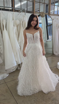 Delicately sequined tulle wedding gown with plunge neckline and light, wispy feather accents.