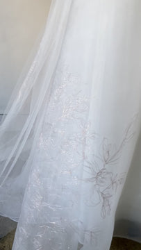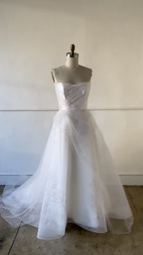 One of a kind wedding dress with draped tulle, blush embroidery of hand drawn Carol Hannah floral motif, cateye strapless bodice, and a-line skirt.